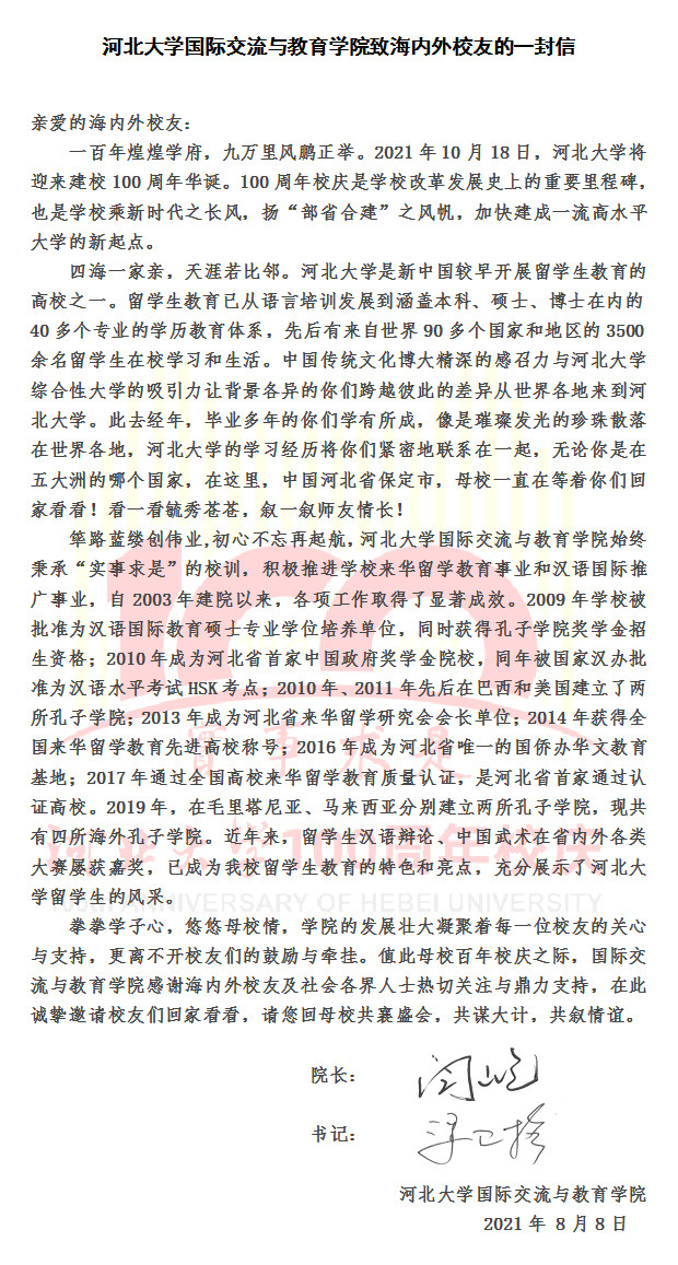 河北大学国际交流与教育学院致海内外校友的一封信