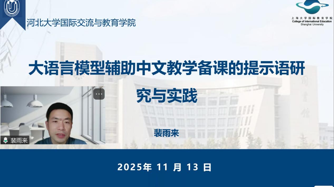 2025年11月13日,为切实提升汉语国际教育专业学生的教学备课能力与技术应用素养,我院组织开展线上专题讲座。本次讲座特别邀请上海大学国际教育学院裴雨来教授主讲,主题为“大语言模型辅助中文教学备课的提升研究与实践”,闫屹院长主持此次讲座。
