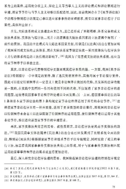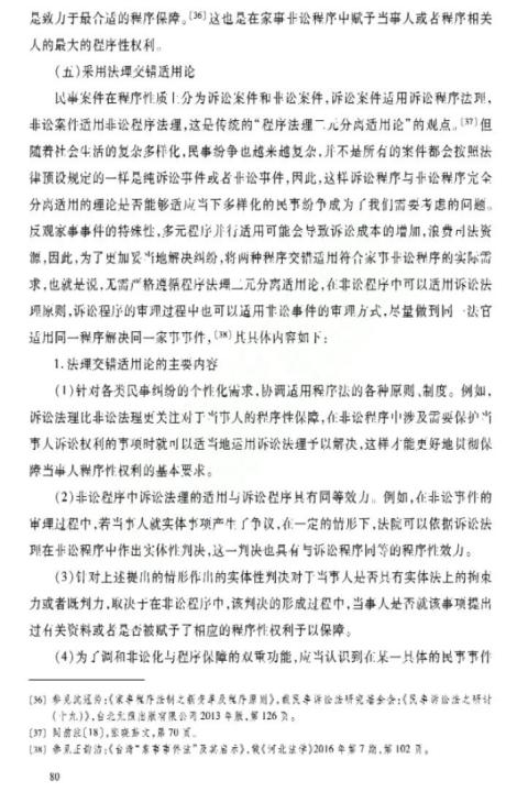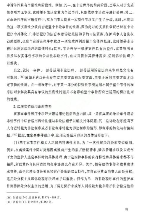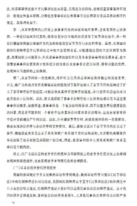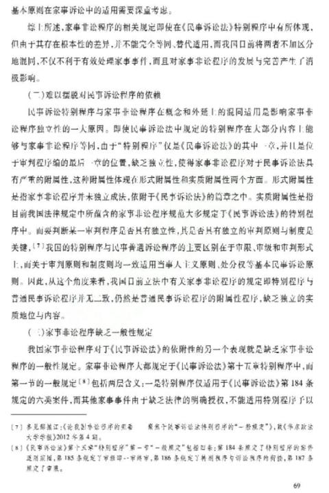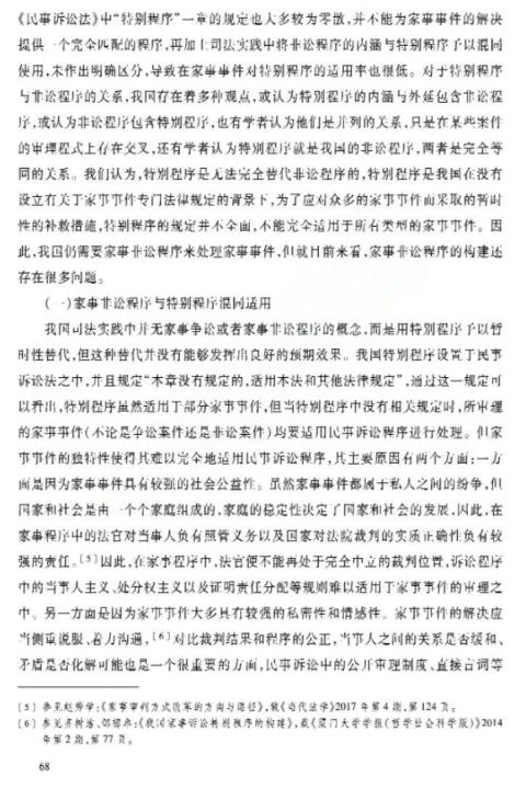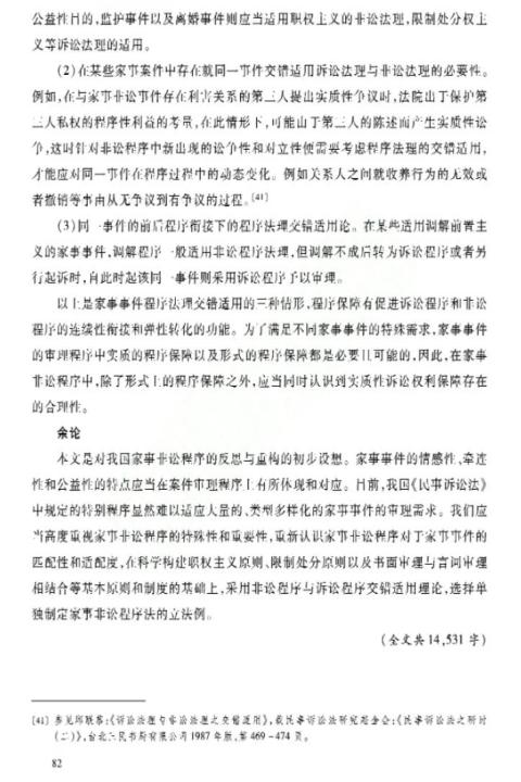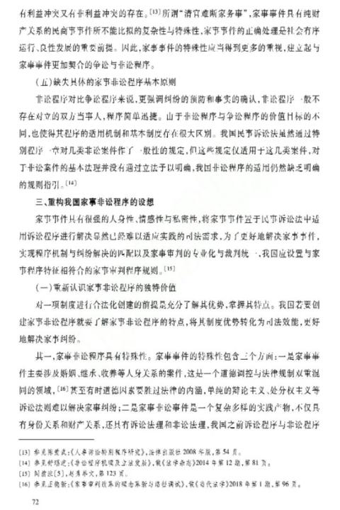 家事事件具有情感性、公益性和牵连性等特殊属性。家事事件讼争性小,家事非讼程序既适用于非讼事件也可以适用于部分争讼事件,比家事争讼程序更具有灵活便捷的特点,更符合家事事件的特征。而我国将非讼程序以特别程序命名,两个概念混同适用对于家事事件的处理和家事非讼程序的发展都产生了阻碍。因此,重构家事非讼程序应正视家事非讼程序与大多数家事案件的适配性,将家事非讼程序职权探知主义、不公开审理主义、书面审理主义等原则确定为家事非讼程序的基本原则;打破程序法理二元分离适用论的桎梏,探索适用程序法理交错适用论;采用家事非讼程序单独立法的立法例,取消特别程序的概念,以非讼程序予以代替。