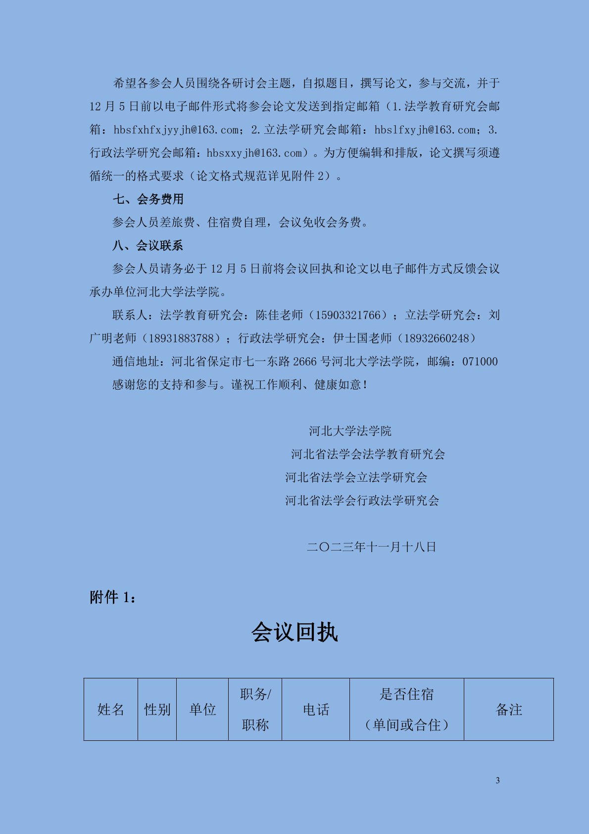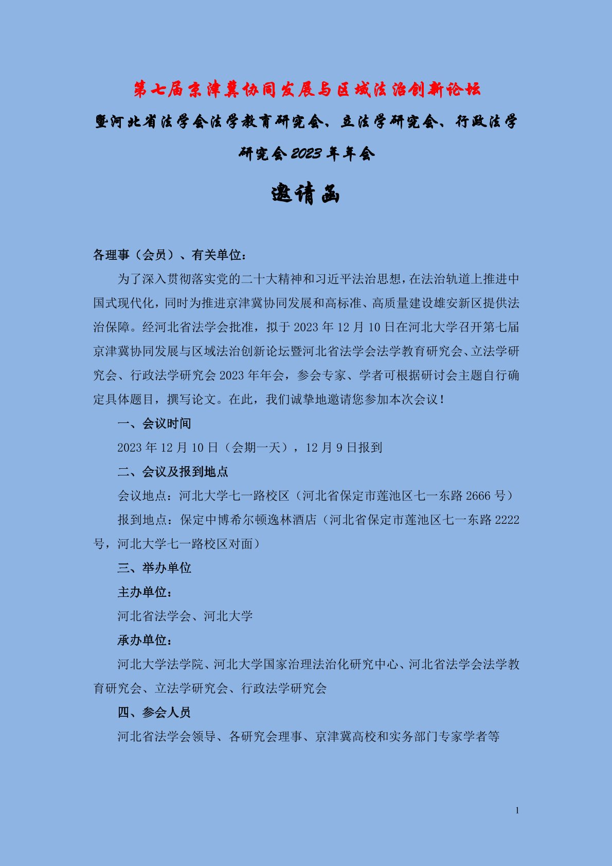 第七届京津冀协同发展与区域法治创新论坛暨河北省法学会法学教育研究会、立法学研究会、行政法学研究会2023年年会邀请函