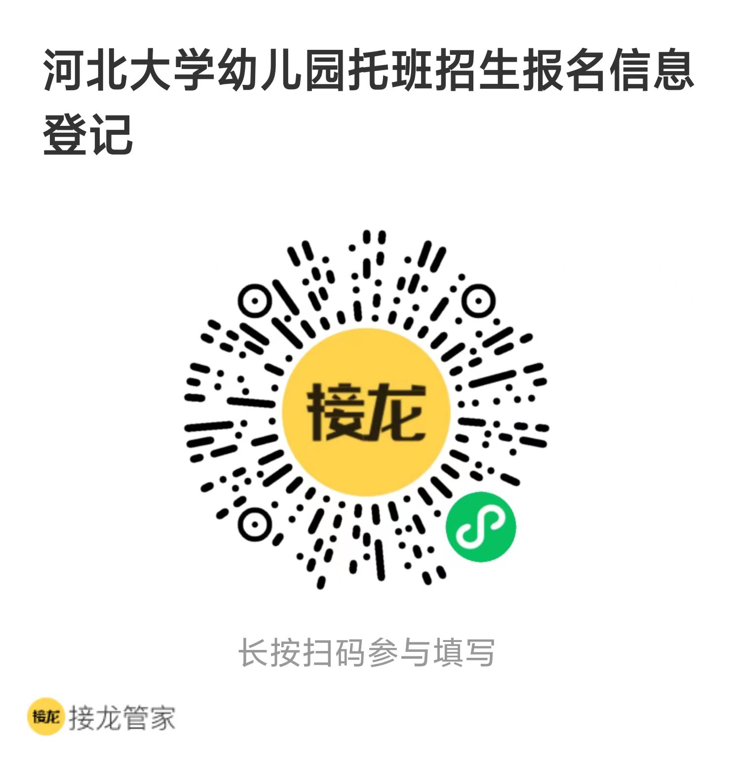 微信扫描下方二维码,通过“接龙管家”小程序线上提交资料进行报名。