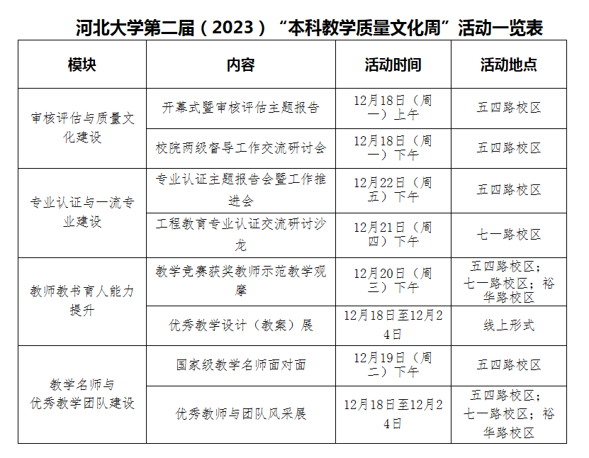 为进一步构建具备河北大学特色的教学质量文化,以卓越质量文化引领本科教育教学高质量发展,学校决定开展第二届(2023)“本科教学质量文化周”活动,特制定如下实施方案。