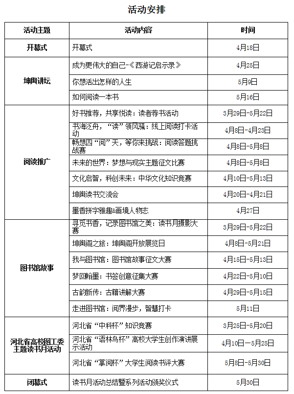 读书月系列活动采取线下和线上联动方式举办,以线下活动为主,线上活动为辅。详情请关注河北大学微信公众号、“河北大学青年”微信公众号、河北大学图书馆网站(http://lib.hbu.edu.cn)、河北大学图书馆微信公众号及“河大微图”公众号。
