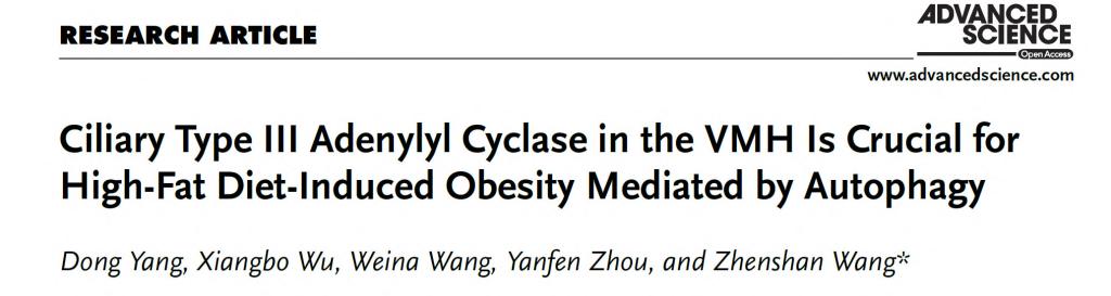 近日,河北大学生命科学学院王振山教授团队在国际主流期刊《Advanced Science》在线发表了题为“Ciliary Type III Adenylyl Cyclase in the VMH Is Crucial for High-Fat Diet-Induced Obesity Mediated by Autophagy”的研究论文。该研究揭示了腺苷酸环化酶3(AC3)基因在小鼠下丘脑神经细胞纤毛部位的表达对高脂肪饲料诱导的肥胖有重要的调控作用。