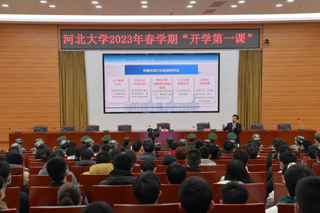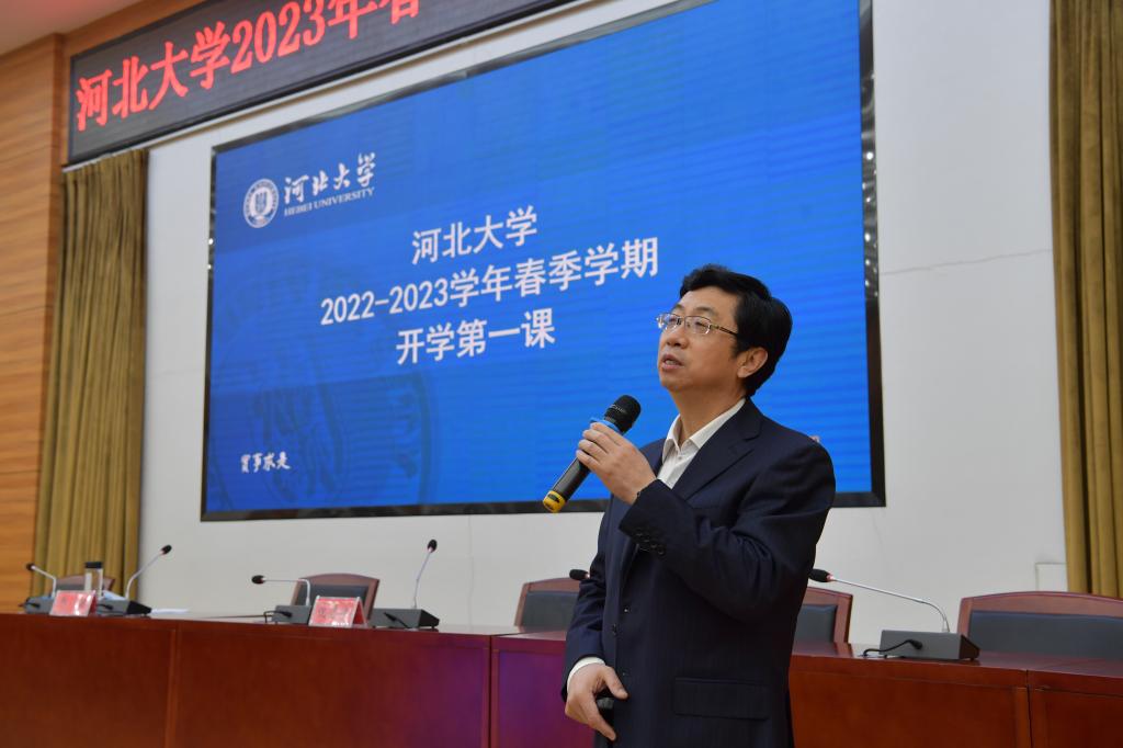 郭健从提高认识,统一行动,持续掀起全面学习宣传贯彻党的二十大精神的热潮;坚定信心,乘势而上,奋力谱写学校事业高质量发展的新篇章;不负韶华,奋发进取,为推进中国式现代化场景贡献青春力量三个大方面与学生们进行了交流。他深情叮嘱同学们一定要持续加大对党的二十大精神的学习宣传力度,创新形式,丰富内容,不断兴起学习宣传热潮,扎实推动党的二十大作出的重大决策部署在学校走深走实、落地见效;要胸怀“国之大者”,坚定正确的政治方向,坚定听党话、跟党走的人生追求,怀抱梦想又脚踏实地,敢想敢为又善作善成,努力使自己成为祖国建设的有用之才、栋梁之才。郭健指出,今年是全面贯彻落实党的二十大精神的开局之年,是实施“十四五”规划承上启下的关键一年,是加快学校“双一流”建设的重要一年。全校上下要按照“1236”基本工作思路,发挥“部省合建”平台优势,解放思想、开拓创新,撸起袖子加油干、风雨无阻向前行,奋力推动学校事业实现高质量发展,为服务经济强省、美丽河北作出新的更大贡献。他向同学们提出三点期望:一要志存高远,胸怀天下;二要不负华年,增长本领;三要强身健体,奋发进取。努力做到今天脚踏实地,为中国梦的“河大篇章”增光添彩;明天担负使命,为全力描绘中国式现代化场景绽放青春和梦想!