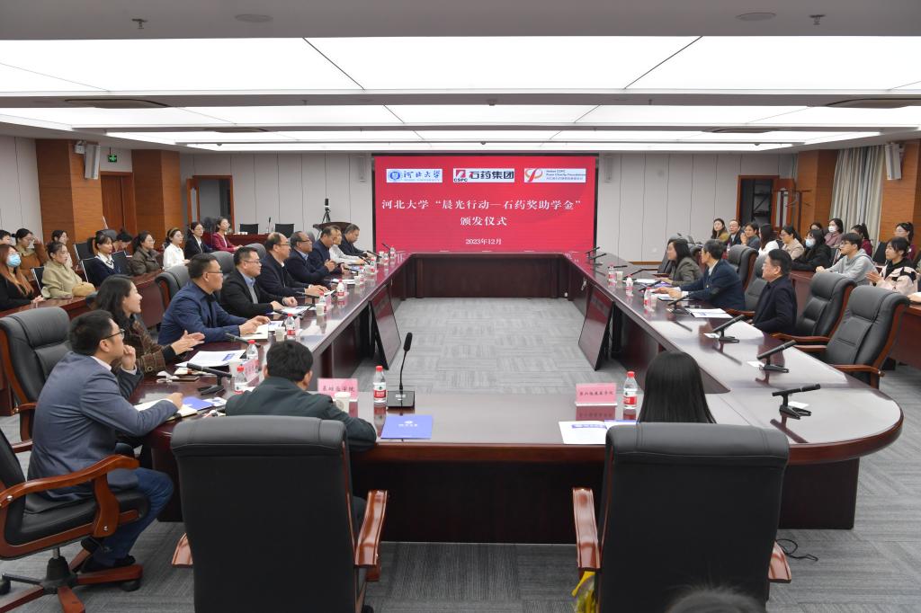 奖助学金颁发仪式上,张永太介绍了集团设立“晨光行动——石药奖助学金”的初衷,希望与河北大学建立合作长效机制,深化校企合作,产教融合,为生物医药产业高质量发展作出新贡献。孟庆瑜希望获奖助学金的同学秉持感恩情怀,强化专业使命,勇担时代重任,希望与石药集团开创校企合作新范例,在服务“健康中国”建设上有新作为。李金善代表学校向石药集团颁授了捐赠证书。马义芝宣读了获得石药奖助学金的学生名单。校企领导共同为获得石药奖助学金的学生代表颁奖。