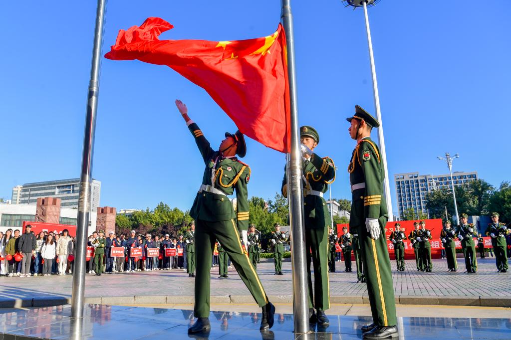 升旗仪式后,师生在主楼前合唱《歌唱祖国》。同学们表示,要在爱国主义精神旗帜的引领下,踔厉奋发、勇毅前行,在推进强国建设、民族复兴伟业中贡献力量,奋力书写为中国式现代化挺膺担当的青春篇章。