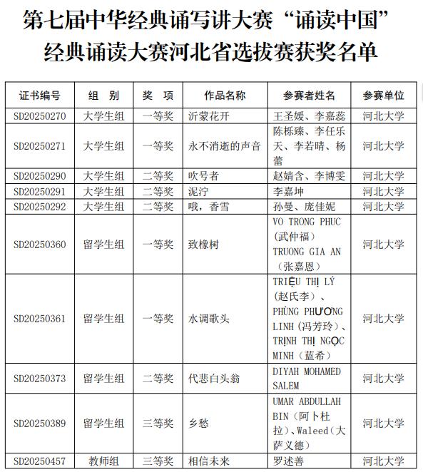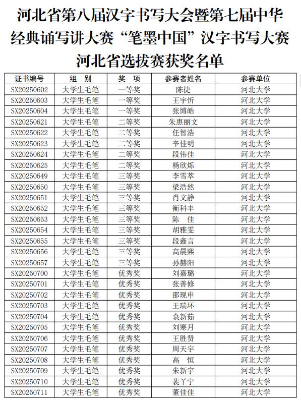 近日,河北省教育厅正式公布了第七届中华经典诵写讲大赛“诵读中国”经典诵读大赛以及“笔墨中国”汉字书写大赛河北省选拔赛的获奖名单。在这场汇聚全省精英的赛事中,河北大学的师生们以卓越的表现脱颖而出,共斩获省级奖项55项,其中一等奖7项、二等奖9项、三等奖11项、优秀奖12项、优秀指导教师奖14项,学校在两项赛事中均荣获优秀组织奖,成绩斐然。
