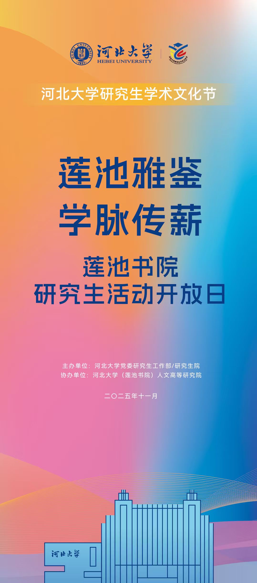 由党委研究生工作部和河北大学(莲池书院)人文高等研究生院共同举办的河北大学研究生学术文化节之“莲池雅鉴·学脉传薪”莲池书院研究生活动将在11月8日和11月16日面向我校研究生开放。