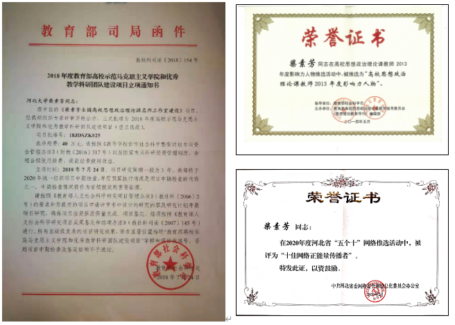 负责人柴素芳为“全国高校思政课教师2013年度影响力人物”、“全国高校优秀中青年思想政治理论课教师择优资助计划”人选、河北省教学名师、河北省师德标兵、河北省十佳网络正能量传播者。2018年,她带领团队获批教育部示范马克思主义学院与优秀教学科研团队建设项目(重点)“柴素芳全国高校思想政治理论课名师工作室建设”。