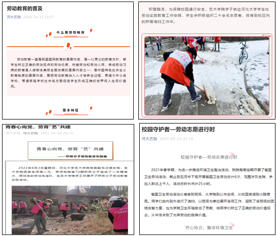 自2020年以来,艺术学院利用微信公众号共发布以劳动教育为主题的推文近20余篇,通过宣传进一步加强劳动教育的成果展示,提升和深化劳动教育效果,深化劳动内涵,教育引导学生们学会劳动、学会勤俭、学会感恩、学会助人,立志成长为德智体美劳全面发展的社会主义建设者和接班人。