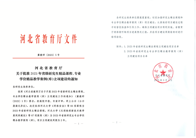 近日,河北省教育厅下发《河北省教育厅关于批准2023年省级研究生精品课程、专业学位精品教学案例(库)立项建设的通知》(冀教研〔2023〕5号),批准河北大学《网络安全》等5项课程为2023年省级研究生精品课程,河北大学《无损检测新技术教学案例库建设》等5项案例(库)为2023年省级研究生专业学位精品教学案例(库)。