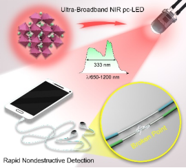 近红外LED凭借在安全监测、食品安全、现代农业、夜视、光伏领域、医疗诊断等方面具有许多潜在应用而受到广泛关注。但是,目前报道的近红外发光荧光粉仍然存在发光效率低、半峰宽窄、热稳定性差等不足,一定程度上限值了其商业化应用。基于此,发光与显示团队报道了一系列具有优异发光和光电转换特性的近红外发光材料。通过阳离子取代策略,分别采用Zn2+-Ge4+或Y3+-In3+代替Gd3Ga5O12中的Ga3+-Ga3+离子对,获得了具有高内量子效率(81.8%)和高热稳定性(94.1%@375 K)的近红外发光材料。通过调控能量传递过程,双钙钛矿La2MgHfO6:Cr3+/Yb3+近红外发射的内/外量子效率、半峰宽和热稳定性得到了显著提高。研究团队进一步将荧光粉制备成小型近红外发光二极管,在植物照明、夜视、生物组织穿透、葡萄糖浓度检测方面展现了优越的性能。此外,团队还首次将制备的近红外LED应用于电缆断点等结构故障方面的快速检测,为设计宽带近红外发射荧光粉提供了一种新颖的切入点,在工业检测和医疗诊断的实际应用方面具有指导意义。