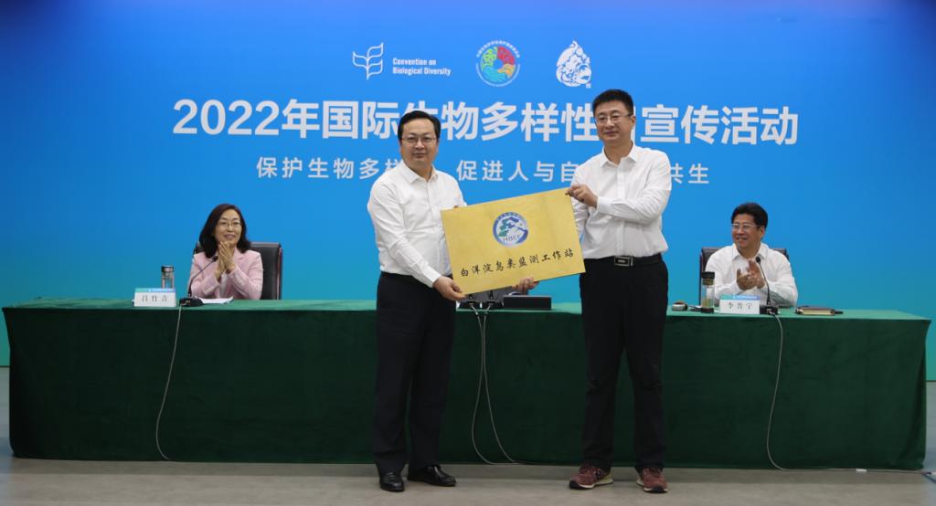 5月22日,2022年国际生物多样性日河北省主场宣传活动在雄安新区举行。省委常委、省政府副省长、雄安新区党工委书记、管委会主任张国华出席活动,并向我校生物多样性研究团队授“白洋淀鸟类监测工作站”牌,生命科学学院教授侯建华作为团队代表参加了此次活动。