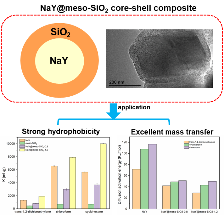 Y沸石因其高比表面积和独特的微孔通道而被认为是一种很有前途的VOCs吸附剂。然而,Y沸石具有强亲水性,用于吸附VOCs时气流中含有的水蒸气可能与VOCs发生竞争作用从而大大降低其吸附性能。此外,Y沸石具有均一微孔结构,吸附VOCs时扩散速率也会受到限制。本研究用疏水性的介孔SiO2包覆NaY沸石合成了核壳复合材料NaY@meso-SiO2。该材料具有优异的疏水性,在含湿条件下对VOCs表现出良好的吸附性能,此外,介孔结构的外延生长也显著促进了VOCs在复合材料上的吸附扩散。该研究为提高NaY沸石的疏水性和扩散性用于高效去除VOCs开辟了一条有前景的途径。