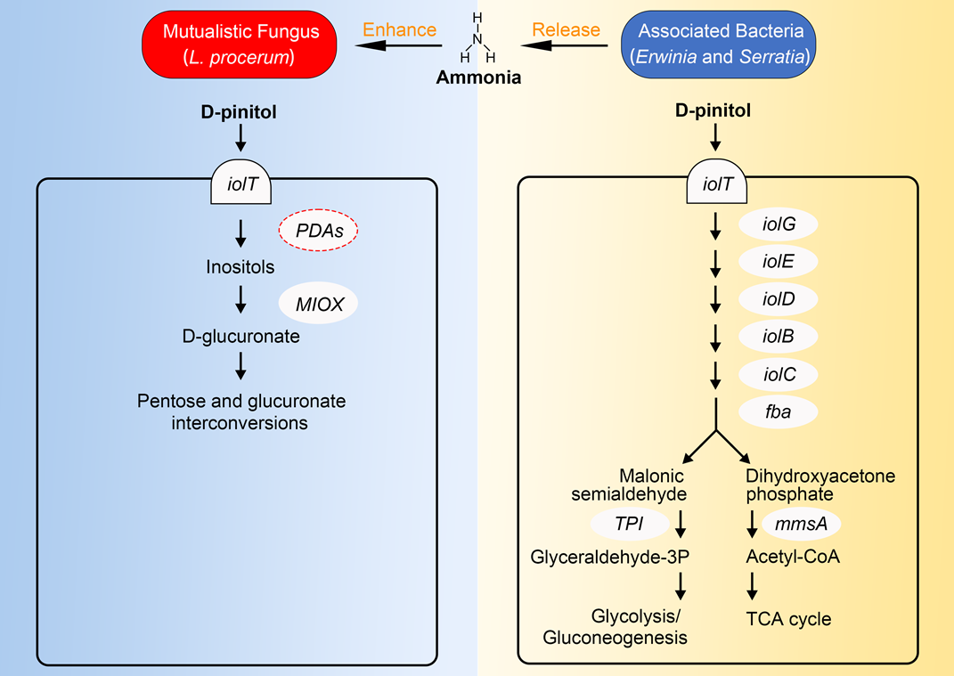 1、通过多组学分析与功能研究,揭示了红脂大小蠹伴生微生物可以作为其体外降解系统帮助其降解寄主油松中具有拒食效应的碳源D-松醇,协助红脂大小蠹入侵与爆发成灾(图1)。该研究成果从寄主适应的角度进一步阐释了伴生微生物在红脂大小蠹-伴生真菌L. procerum这一共生入侵复合体入侵成灾中的作用机制,丰富和完善了虫菌共生入侵理论。相关成果“Symbiotic microbes aid host adaptation by metabolizing a deterrent host pine carbohydrate D-pinitol in a beetle-fungus invasive complex”以河北大学为第一单位发表于Science Advances(IF5= 16.8955,中科院1区TOP,DOI: 10.1126/sciadv.add5051),我校刘芳华副教授为第一作者,孙江华教授为通讯作者,康志伟副教授参与部分工作。