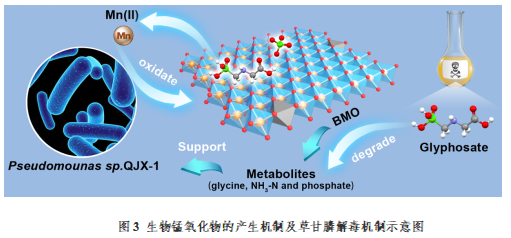 团队青年教师于洁博士利用生物锰氧化物(BiogenicManganeseOxides,BMO)高吸附和氧化活性,建立了一种基于锰氧化菌的锰离子循环生物氧化(ManganeseOxidationCycle)新体系,在无需外加营养物质的条件下,实现了有机微污染物草甘膦(Phosphate)的降解及代谢产物的同步利用。研究成果在线发表在本领域学术期刊Journal of Hazardous Materials(中科院一区TOP,IF=14.224)的2023年首卷首期。