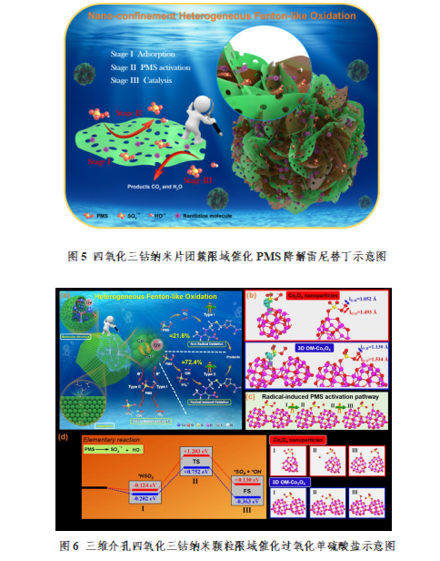 团队青年教师马溢阳博士与清华大学张正华副教授研究团队合作,通过设计表面多介孔结构的四氧化三钴纳米片,可以实现反应物分子穿梭进入纳米片团簇空间限域内,在限定空间中发挥氧化降解效能;提出了一种液相快速还原法,可以实现活性位点重生且富集氧空位,使得催化剂具有持久有效的催化性能。形成了调控催化剂结构形貌特征以实现催化性能提升与理化性质优化的新策略。进一步,通过密度泛函(DFT)理论计算证实,有序排列的四氧化三钴纳米颗粒对目标污染物分子具有更强的吸附能和更低的活化能垒。电子顺磁共振(EPR)技术也揭示这种结构调控手段可以实现体系中单线态氧的生成,更重要的是激发多重氧化作用机制共存于二甲胺类PPCPs的降解过程。