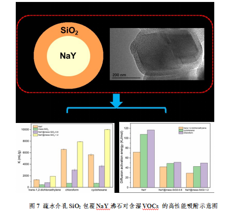 团队青年教师刘慧娟博士与南京大学环境学院龙超教授研究团队合作,用疏水性的介孔SiO2包覆NaY沸石合成了核壳复合材料NaY@meso-SiO2。该材料具有优异的疏水性,在含湿条件下对VOCs表现出良好的吸附性能,此外,介孔结构的外延生长也显著促进了VOCs在复合材料上的吸附扩散。该研究为提高NaY沸石的疏水性和扩散性用于高效去除VOCs开辟了一条有前景的途径。