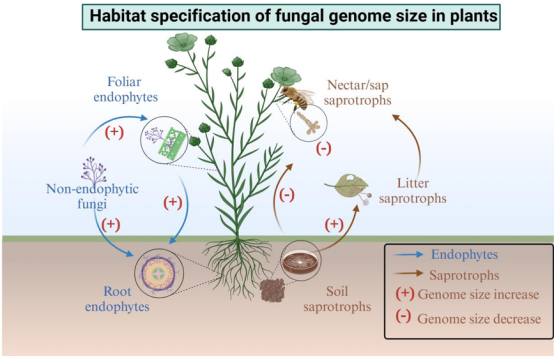 图2. 不同植物组织特定微环境下的内生真菌和腐生真菌群落的基因组大小
