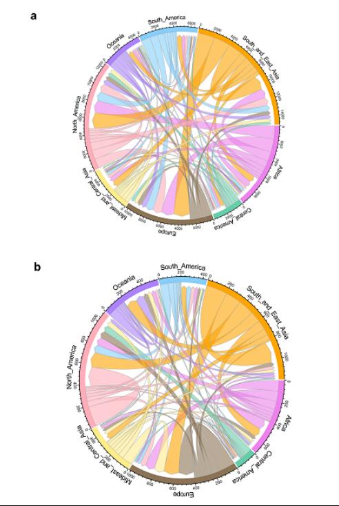 图为外来种和入侵种贸易的物流网络:A, 贸易外来种;b, 贸易入侵种