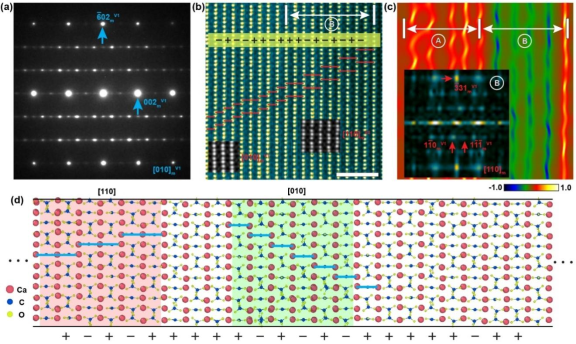 碳酸钙是自然界中最丰富的无机矿物与生物矿物之一,无水碳酸钙一般具有方解石、文石、球文石三种晶型,相比于三方晶系的方解石和正交晶系的文石,球文石晶体在获得X射线图谱的百年以来,人们发现无论是六方还是正交结构或者其它空间群一直不能完美的描述其结构,球文石晶体结构因此存在着诸多争议、悬而未决。真实的认识球文石晶体结构,对于其在生物医药、生物矿化、精细化工、现代光学等多领域的应用有着广泛的帮助。由于球文石内部高密度的堆垛无序的结构,导致传统光源方法面临着巨大的挑战,基于此,该项工作综合利用多尺度透射电子显微学方法、机器学习、第一性原理计算与分子动力学模拟,在球文石碳酸钙的钙原子直接成像基础上,通过电子衍射和计算模拟,发现其具有多变体的伪六方单斜结构特征,并在原子级尺度上成功解析了其高密度层错的结构,揭示了碳酸根基团在层间堆垛和层内旋转的本质原因,这对于解析其他相关多型体结构具有重要意义。