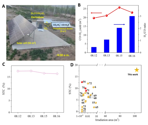 本工作中,李亚光课题组合成了Ag单原子负载NiO纳米片(2D Ni1Ag0.02O1),原位DRIFTS和理论计算表明,CO2在2D Ni1Ag0.02O1的不对称吸附增强了CO2的活化能力,这使得2D Ni1Ag0.02O1催化剂在室外低密度太阳光辐照下展现出高效的光热逆水煤气反应,在标准太阳光辐照下,其CO产率达到1065 mmol g-1h-1。基于2D Ni1Ag0.02O1催化剂辅助的光热CO2加氢系统和商用的光伏电解水制氢系统,李亚光课题组与孟庆波课题组联合研制了光照面积达到103平方米的人工光合作用系统示范。该示范能够摆脱电网依赖,实现全离网运行;在自然太阳光辐照下,能够将CO2和H2O转换为绿色合成气,其产量达到~22m3/天,H2/CO比可以调整为0.4-3,平均太阳能-化学能转换效率为17.0%。这项工作显示了光伏-光热耦合技术在人工光合作用领域的应用潜力,为光驱动碳中和领域的深度开发提供了一条可行的路径。