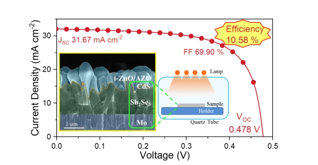 硒化锑(Sb2Se3)因其独特且卓越的光电性能,在新型光伏器件前沿科技展现出巨大的应用潜力。然而,异质结界面及吸收层内存在的载流子复合问题制约着硒化锑太阳能电池光电转换效率的进一步提升。近日,该团队提出了一种光退火处理技术,实现了Sb2Se3/CdS异质结界面的有效调控及器件光电转换效率的提升。应用光退火处理技术,能够促进异质结界面附近的元素扩散及界面原子重新排列,同时能够促进缓冲层中的镉(Cd)元素向Sb2Se3吸收层内部的扩散,这一过程有效地减少了异质结界面处的界面缺陷和硒化锑深能级体缺陷,显著提升Sb2Se3/CdS异质结的质量。制备的Sb2Se3/CdS异质结太阳能电池获得10.58%的光电转换效率(认证效率10.18%),是目前已报导的硒化锑太阳电池的世界记录。这项研究不仅展示了光退火处理在提升硒化锑太阳电池缺陷钝化方面的巨大潜力,还为光伏领域的研究人员提供了全新的研究思路。