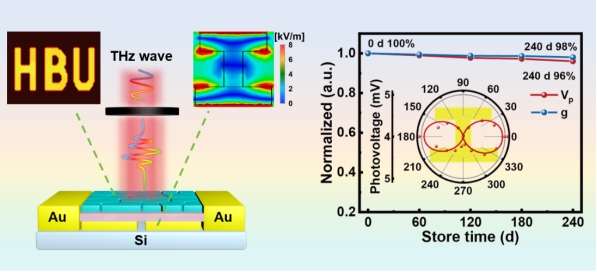 太赫兹(THz)波是指频率为0.1 THz-10 THz的电磁波,具有高穿透性、生物安全性和指纹特性等独特优势,被广泛应用于生物医学、安全检查、通信和遥感等领域。THz偏振探测技术能够捕获多维信息,包括强度,相位和偏振状态等,在生物医学成像领域中具有潜在应用价值。然而传统THz探测技术存在系统复杂、探测功能单一、响应速度慢、探测灵敏度低等问题。为了实现小型化、高效THz偏振探测,团队提出了利用新型钙钛矿/超表面的热电效应实现室温下高效THz偏振探测及成像,该结构的设计增强了局部场热电效应和偏振响应。响应高达94 V/W,响应时间μs量级,噪声等效功率低至5.03 pW/Hz1/2,各向异性比为1.38。此外,高温、高湿度和偏振成像实验验证了器件具有良好的稳定性。这项工作为实现高性能、稳定的THz偏振检测技术提供了新的途径,在高分辨率医学成像、安全检测、医工交叉等领域具有巨大的应用潜力。