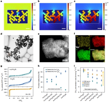 我国具有十分丰富的页岩气资源,已探明可采储量居全球第一。在清洁能源驱动下,将页岩气的主要成分甲烷高效、高选择性催化转化为高附加值碳氢化合物对于实现碳资源高值化利用意义重大。然而,传统甲烷光催化氧化偶联工艺面临甲烷转化率低、反应稳定性差等问题,且产物主要为气态乙烷,储运成本相对较高。基于此,郝宇晨博士、叶金花教授等人开发出一种多孔二氧化钛封装金纳米颗粒的新型光催化剂,通过蒸汽活化策略,在太阳光照射下实现甲烷高选择性氧化偶联制备丙烷,产率和选择性分别高达1.4毫摩尔每小时和91.3%,性能显著优于已报道催化体系。此外,相比于气态乙烷产物,丙烷可在常温下实现液化,从而显著降低了储运成本。机理研究表明,蒸汽活化能够使金纳米颗粒表面产生晶格拉伸应变,改变其电子结构,从而增强对反应中间体的吸附,促进甲烷深度偶联为丙烷。同时,多孔二氧化钛框架内的纳米限域催化微环境能够有效延长反应中间体停留,从而进一步提高甲烷深度偶联效率。本研究为页岩气资源的高效、高附加值利用提供了新策略,对推动光驱动甲烷转化技术发展具有重要意义。