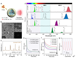 Er3+、Nd3+、Ho3+是近红外二区发光的理想发光中心,但其余辉发射一直很难实现。物理学院杨艳民教授等人选用具有较低声子能量的氟化物NaYF4作为基质材料,通过严格控制其尺寸和形貌,在NaYF4基质中首次实现了Er3+、Nd3+、Ho3+超长近红外二区余辉发射并阐释了余辉机理。因红外二区具有较好的生物穿透性,而余辉又无需激发光来维持,故近红外二区余辉材料在生物学领域有广泛的应用前景,该工作将进一步推动余辉材料在生物学领域的应用。