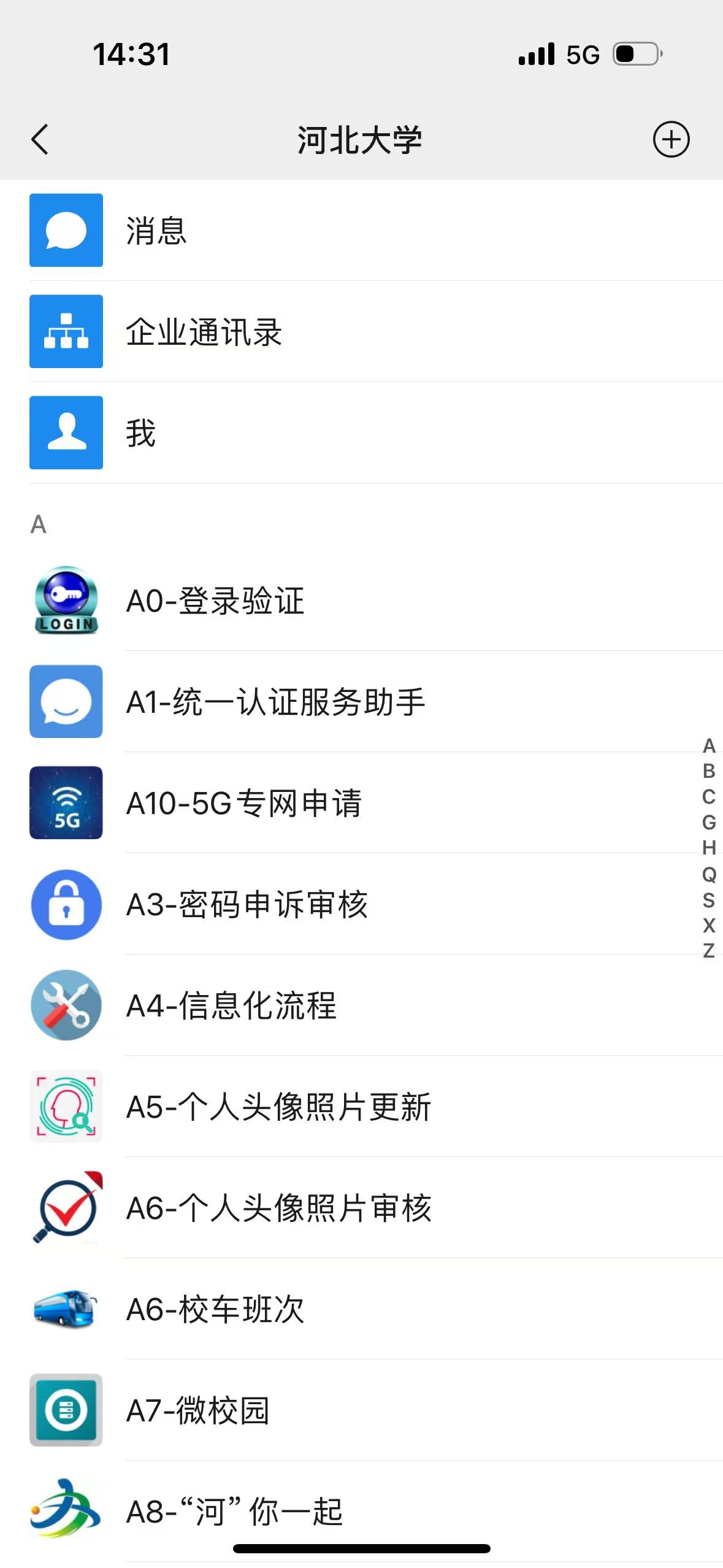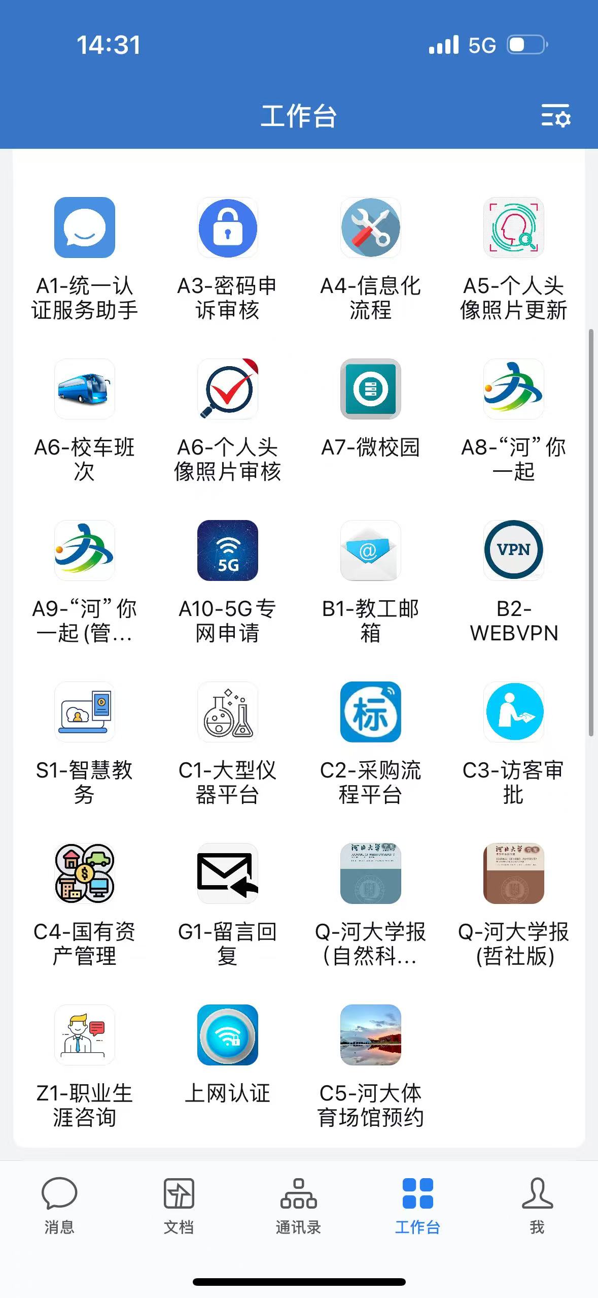 3.在企业微信(手机应用商店下载企业微信APP或PC版客户端)中工作台打开学校的企业微信应用,可使用企业微信的完整功能,在工作台访问学校各类业务应用,如统一认证服务助手、信息化流程、WEBVPN等;以河北大学企业微信用户的身份,使用企业微信的高级功能,如视频会议、群直播、群聊等。