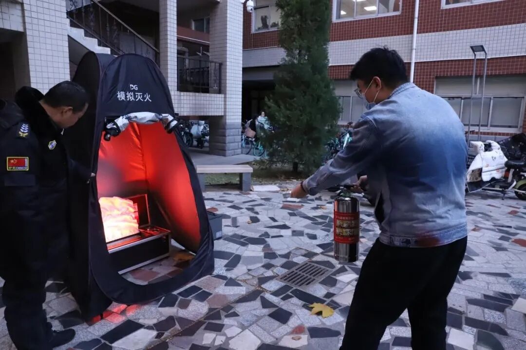 在实操体验环节,李昊辰老师现场细致讲解灭火器 “提、拔、握、压”四步操作法,逐一示范动作要领与安全注意事项。随后,学生代表上前实操演练,在专业指导下完成灭火器灭火全过程,切实掌握了初起火灾的处置技能,有效提升了实战应用能力。
