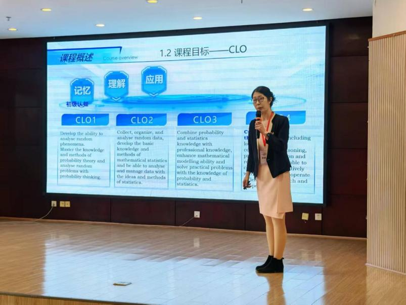 决赛现场,顾芳老师以《明辨为线贯穿全程-概率论与数理统计智慧课堂构建与实践》为汇报主题,系统陈述了从教学目标的重构入手,以学生为中心,以教学为导向,将“价值塑造、知识传授、能力培养”融合,利用任务引擎、案例驱动、AI实践、分组任务四大教学路径构建三维思辨课堂,将明辨性思维和思政元素融入教学每一个环节。
