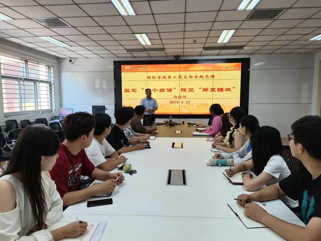 习近平总书记明确指出,“没有网络安全就没有国家安全”。为深入贯彻落实党中央关于全面从严治党的要求,引导学生党员坚定理想信念,强化责任担当,6月27日下午在A1-302,国际学院院长杨晓晖教授为第二党支部学生党员们讲授了一堂生动而深刻的专题党课。
