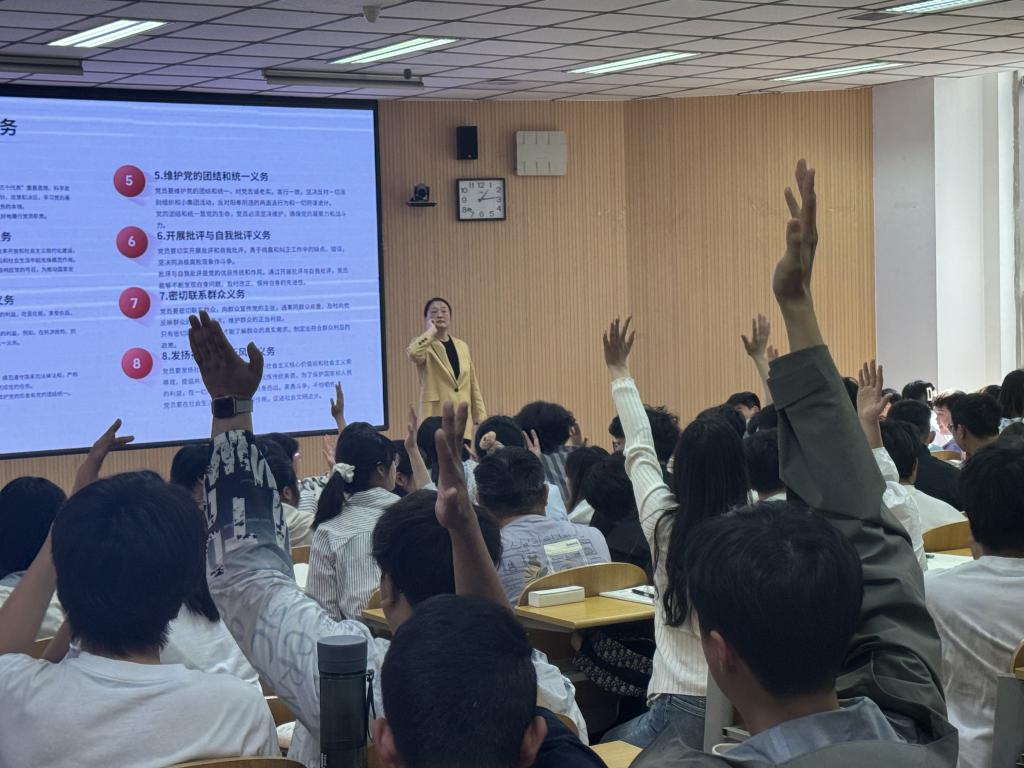 在党员责任与义务板块,同学们分成12个小组,围绕“作为一名积极入党的同学应该做什么”展开了热烈且深入的讨论。各小组成员踊跃发言,结合自身学习与生活实际,从思想提升、行动落实等多个维度分享见解。讨论结束后,每组选派代表上台发表看法。同学们精彩的发言赢得现场阵阵掌声,通过这一环节,同学们不仅加深了对党员责任的认识,更在交流中碰撞出思想的火花。此外,课程还进一步强调新时代党员的责任与使命,包括在实现中华民族伟大复兴征程中以及应对风险挑战中的担当。