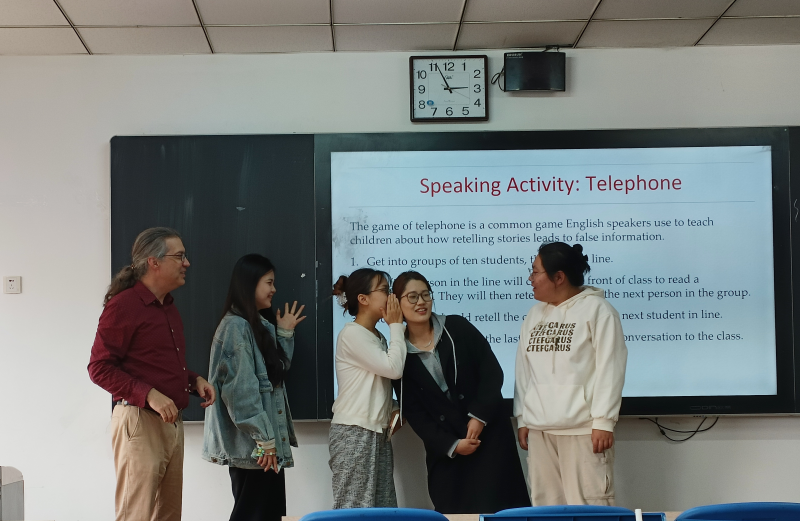 4月8日,一场别开生面的英语传声筒游戏活动在2022级新闻学乙班展开。在外教David的带领下,全体同学踊跃参与,全身心投入到这次充满趣味的学习活动中。游戏开始,David老师向每组的第一位同学悄声传达英语句子,随后组员依次轻声传递,现场氛围轻松愉快。此次活动将趣味与英语学习相融合,不仅让同学们在欢笑中深刻领悟到准确英语发音在交流中的重要性,也让口语能力得到锻炼。小组协作传递句子的过程,更是增进了彼此间的默契,团队合作能力显著增强。