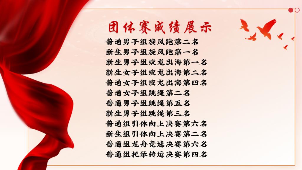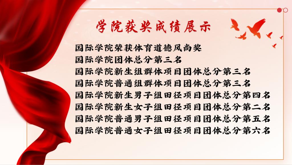 在全体师生的共同努力下,国际学院取得了河北大学运动会团体总分第三名的好成绩,其中获新生组群体项目团体总分第三名,普通组团体项目团体总分第三名,新生男子组田径项目团体总分第四名,新生女子组田径项目团体总分第二名,普通男子组田径项目团体总分第五名,普通女子组田径项目团体总分第六名,以及体育道德风尚奖。