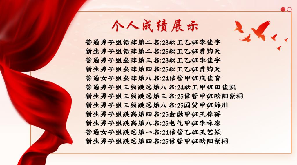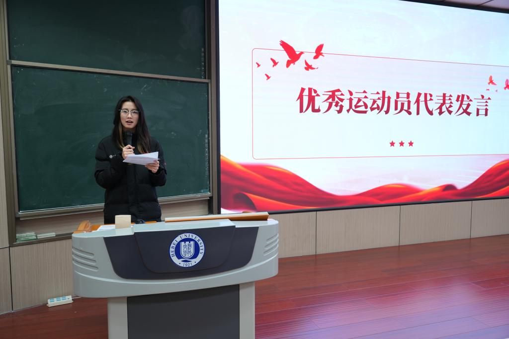 王建慧老师总结了本次运动会的全程经纬,既为开幕式上以青春风貌亮相的全体同学颁授纪念证书,也向赛场摘桂的运动员们致以盛赞,更向幕后默默奔忙的工作人员道尽谢忱。她谈及,国际学院的学子们在赛场上所彰显的,从来不止是超越自我的体育精神,更是青年群体里最动人的风度。以此为序章,她更号召同学们将这份赛场淬炼出的热血与赤诚,融入往后的学业与生活:让冲刺时的专注成为治学的底色,让协作中的共情化作处事的温度,以青春之我,向更远的山海舒展锋芒。