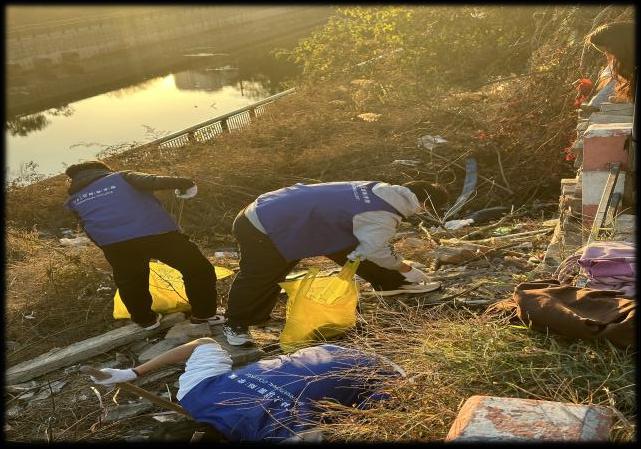 学院组织志愿者赴灵雨寺社区开展河道垃圾清理志愿活动。前期通过线上招募、线下动员确定志愿队伍,活动中志愿者们手持工具,清理河岸包装袋、烟头、废弃渔网等各类垃圾,用汗水改善河道环境,践行生态保护的青春承诺。