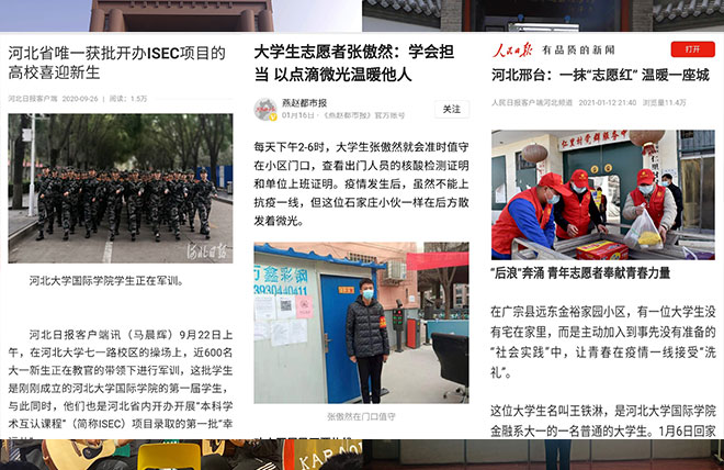 2020年冬天,河北省抗疫工作吹响集结号,国际学院180余名学生返乡后,响应号召加入疫情防控志愿者队伍中,他们充分发扬“奉献、友爱、互助、进步”的志愿服务精神,协助社区开展疫情防控工作,不计报酬、不辞辛劳,展现出当代大学生志愿者的青春风采。他们在实践中增强为人民服务的本领,用行动为家乡河北战胜疫情贡献青春力量,让青春在党和人民最需要的地方绽放绚丽之花。