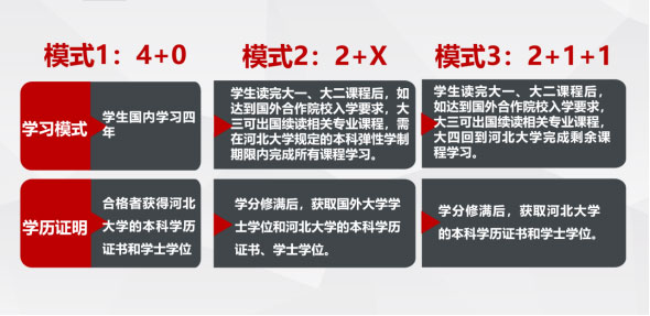 ISEC项目采用"中外方高校的双向学分互认"机制,学生就读的国内阶段部分课程可被境外合作院校认可,学生在国外学习阶段的部分课程可被ISEC项目中方高校审核认定。河北大学ISEC项目本科阶段专业总计学制一般为四年,其中国内阶段不能少于两年,项目具体实施过程中,可分为"4+0","2+1+1""2+X"三种学业发展模式。其中选择不出国留学的学生(4+0模式),在学校规定期限内达到所在专业毕业要求,由河北大学具印颁发经教育部电子注册、国家承认学历的本科学历证书(证书种类为普通高等教育毕业证书),符合学校学位授予条件,颁发河北大学学士学位证书。如学生选择在境外交流一段时间,再回到河北大学完成本科学业(2+1+1模式),其在国外学习阶段的课程学分可与ISEC项目同类课程进行内容审核与学分置换,其毕业资格审核要求同"4+0"模式学生保持一致。学生如选择在境外完成本科最后阶段的学业(2+X模式),满足境外院校对授予学位所规定要求的,可申请境外大学学士学位,学生获得外方高校本科学士学位且在河北大学规定的本科学制年限内回国,经学校本科毕业资格审查合格后,可颁发河北大学的学历和学位证书。