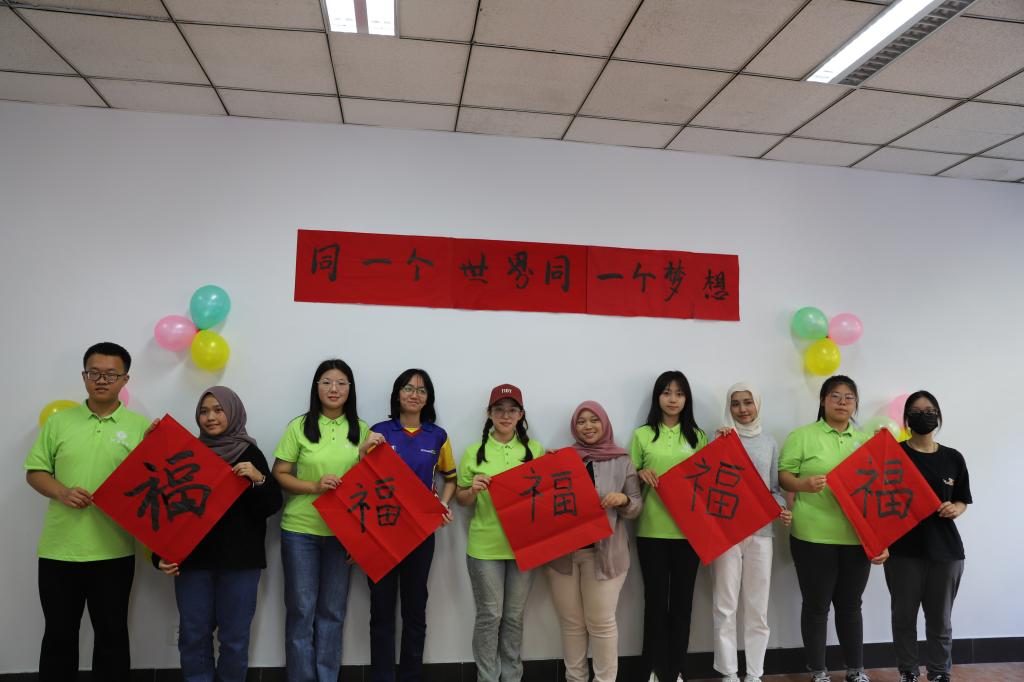 国际学院的学子们为马来西亚的朋友们准备了友谊树和写有“龙”字的宣纸。大家手掌印在友谊之树上,留下了自己的名字和祝福语,象征着两国友谊的印记。同时,每个人都在宣纸上写下了自己的祝福和期待,这些祝福将成为两校师生联谊的美好见证。