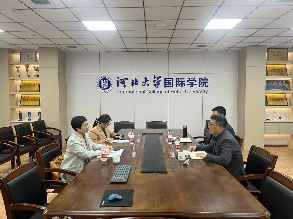 杨晓晖院长对武炜一行来访表示热烈欢迎,介绍了河北大学国际学院的总体发展历程、ISEC项目建设、学生升学就业以及国际交流合作等方面情况。武炜主任就唐山师范学院ISEC项目总体情况、招生及管理模式等方面进行了介绍。