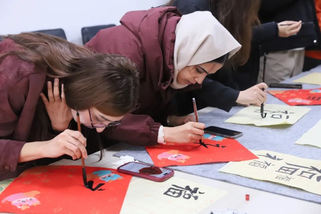 接下来国际学院艺术教育中心书画社的成员们邀请留学生进行写“福”字的书法体验活动。在书画社成员的指导下,留学生们挥毫点染,笔下生花,传递“福”气。