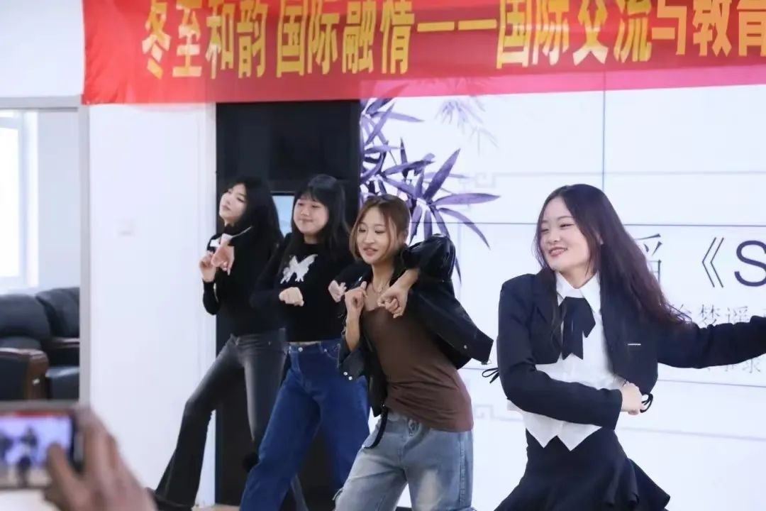 品尝完热乎乎的饺子之后,开启了追寻古典文化之旅。国际学院学生佟启华、徐梦遥、马子敬、张晗带来的开场舞蹈曲《shhh》,让大家享受了一场极致的视觉盛宴,她们用舞蹈点燃了冬日里的激情。
