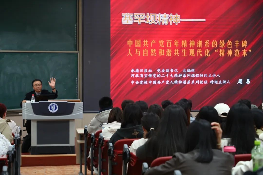 3月20日,我院举办“塞罕坝精神—中国共产党百年精神谱系的绿色丰碑,人与自然和谐共生现代化‘精神范本’”专题讲座,承德日报社党委副书记、总编辑周易应邀主讲,为两百余名师生带来了一场融生态史、党史与治理智慧于一体的精彩讲座。讲座由国际学院党委副书记刘洋主持。