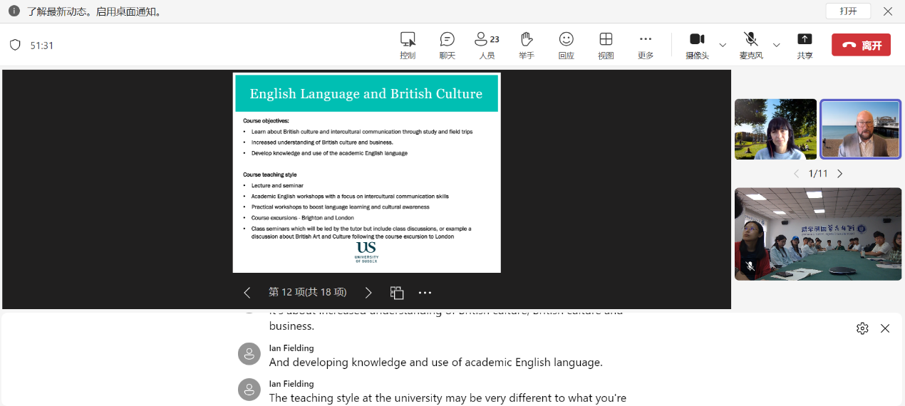本次说明会由ISEC办李梦老师主持。会上英国萨塞克斯大学暑期课程项目负责人对萨塞克斯大学整体情况、项目课程安排、学校食宿以及设施情况进行详细介绍。我院学生就项目期间学生交流活动及班容量等方面情况向英国萨塞克斯大学项目负责老师进行了线上咨询。学院项目建设与质量保障办公室负责老师就学生完成课程后的结业证书和推荐信相关情况与萨塞克斯大学项目负责人进行了交流。