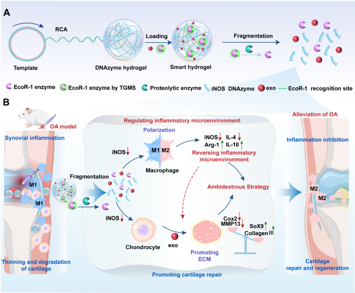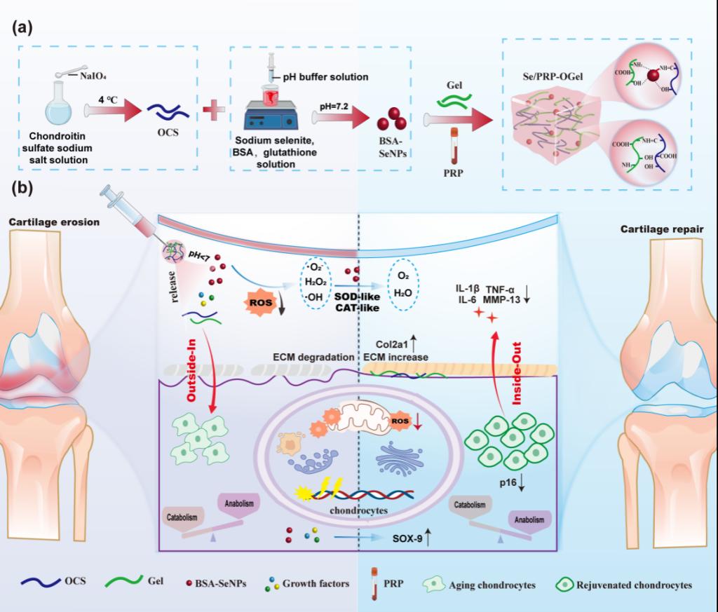 骨关节炎是一种高致残性的退行性关节疾病,当前临床治疗手段效果有限,难以实现软骨的有效再生与修复。靳祎教授团队长期致力于OA的发病机制研究与创新治疗策略开发,聚焦于关节微环境的精准调控和促进软骨再生。在《Biomaterials》上发表的研究中,首创“自供给型DNA水凝胶”,通过响应关节炎症微环境,精准释放iNOS靶点的DNA酶和干细胞外泌体,抑制TNF/MAPK/ERK信号通路,同步实现微环境重塑与软骨修复 。在《Journal of Colloid and Interface Science》上发表的论文中,提出“由外向内”和“由内向外”的整合策略,设计硒纳米酶交联复合水凝胶(Se/PRP-OGel),兼具高效清除活性氧和持续释放生长因子的能力,逆转软骨细胞衰老,促进细胞外基质合成,实现关节功能重建。