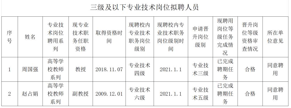 根据《关于组织开展第三轮专业技术岗位聘用中期晋升工作的通知》要求,经个人申报、工作人员对申报人员的资格条件审核、业绩成果量化计分排序、我院专业技术岗位聘用考评推荐小组考核评议、党政联席会集体研究,确定了各岗位拟聘人员,现公示如下: